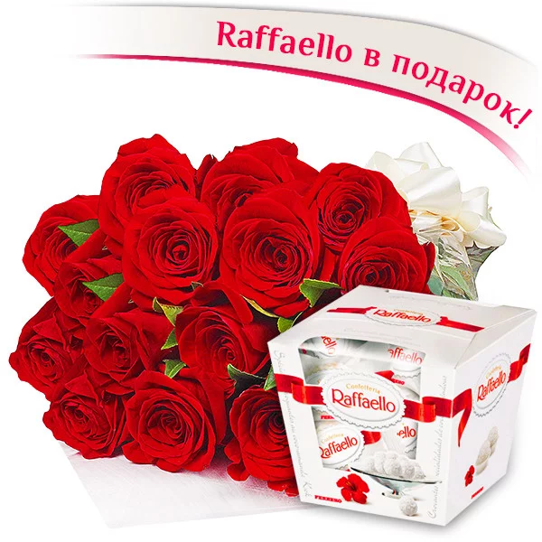 11 роз: роза красная - 11 шт (50 см), целлофан, конфеты "Raffaello" 150 г. - 1 шт..