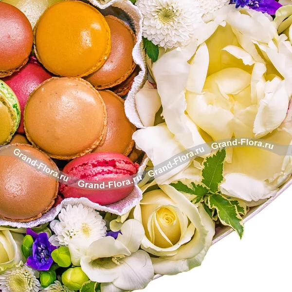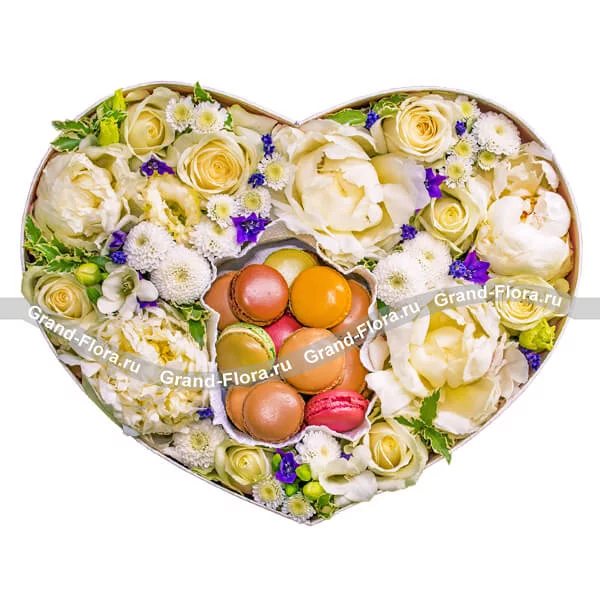 Стандартный (на фото): пионы белые - 5 шт., роза белая - 7 шт., хризантема белая (сантини) - 1 шт., эустома белая - 1 шт., фрезия белая - 2 шт., питтоспорум - 1шт., статица фиолетовая - 2 шт., оазис, фетр белый, макарунс - 20 шт., коробка большая в виде сердца (35х35см).