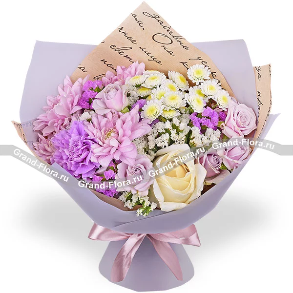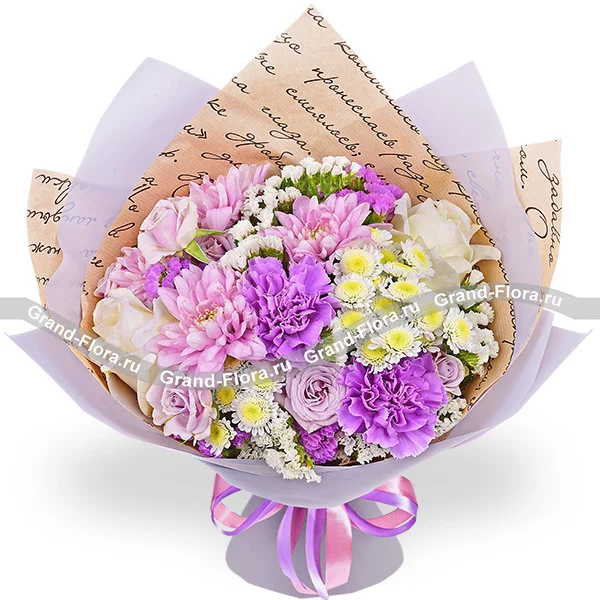 Стандартный: роза белая - 2 шт., роза кустовая фиолетовая - 1 шт., гвоздика фиолетовая - 2 шт., хризантема сантини - 2 шт., хризантема кустовая ромашковая фиолетовая - 2 шт., статица, упаковка, лента. Примерный размер: 30Х30 см.