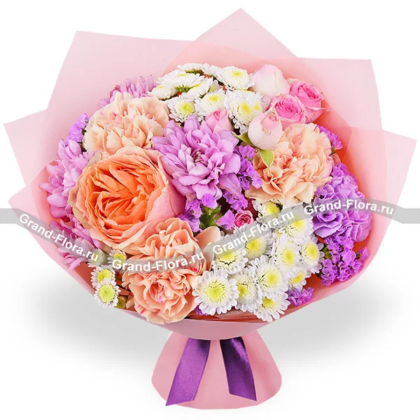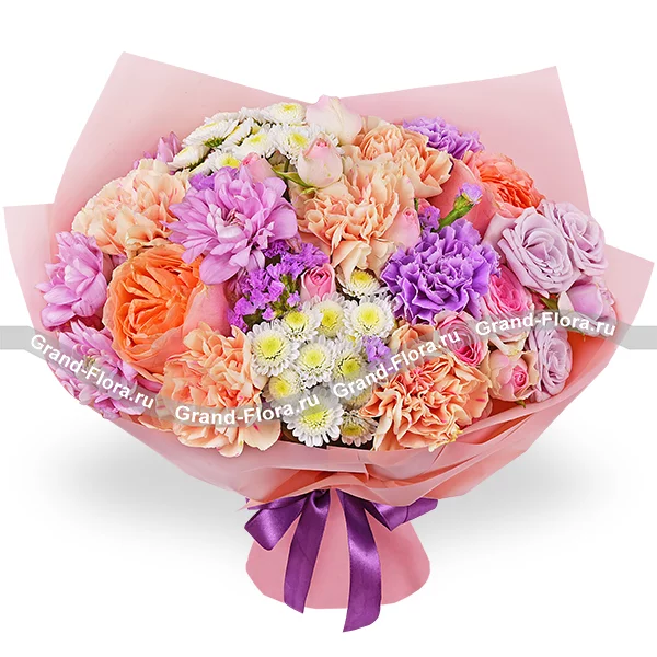 Стандартный: роза персиковая - 2 шт.,гвоздика персиковая - 5 шт., гвоздика фиолетовая - 2 шт., роза кустовая розовая - 2 шт., роза кустовая фиолетовая - 2 шт., хризантема кустовая ромашковая фиолетовая - 2 шт., хризантема сантини - 2 шт., статица, упаковка, лента. Примерный размер: 35Х35 см.